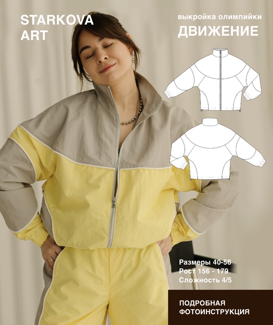 Выкройка олимпийки прямого силуэта, большого объема. Полочка и спинка имеют деление на кокетки, центральные и боковые части. Кокетка имеет округлую форму. Линия плеча расширена. В рельефных швах полочки расположены карманы. Мешковины карманов с изнаночной стороны образуют внутренние карманы.