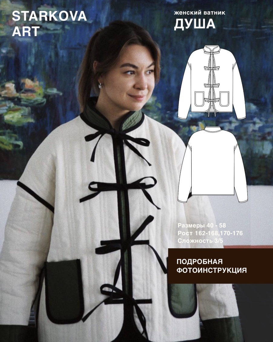 Выкройка женского ватника прямого силуэта, большого объема. Рукав длинный одношовный. Воротник стойка. На деталях переда накладные карманы и ветрозащитная планка. Застежка на 4 пары завязок.