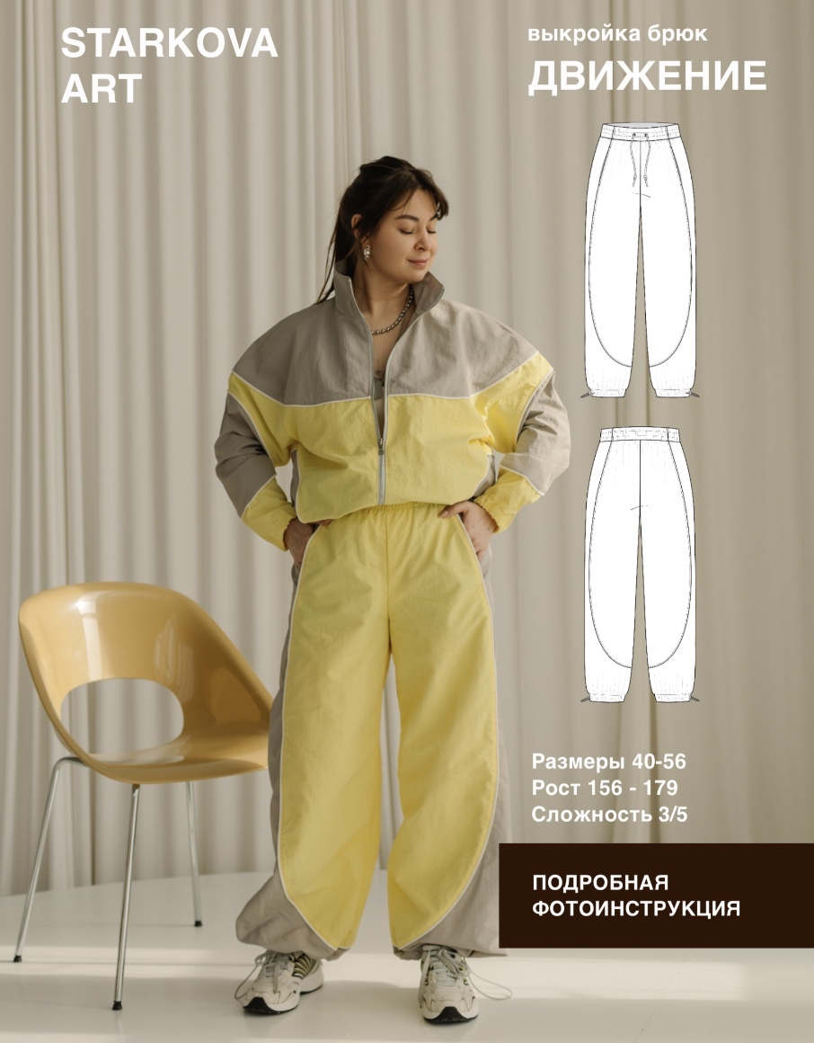 Выкройка женских брюк прямого силуэта, большого объема. Состоят из передних, боковых и задних частей. Пояс брюк цельнокроеный, в пояс вставлена эластичная тесьма. Отделочные строчки по поясу образуют кулиску для шнура. В передних рельефных швах расположены карманы. Низ брюк обработан кулиской с люверсами, собирается на шляпную резинку с фиксаторами. Длина брюк до щиколотки.